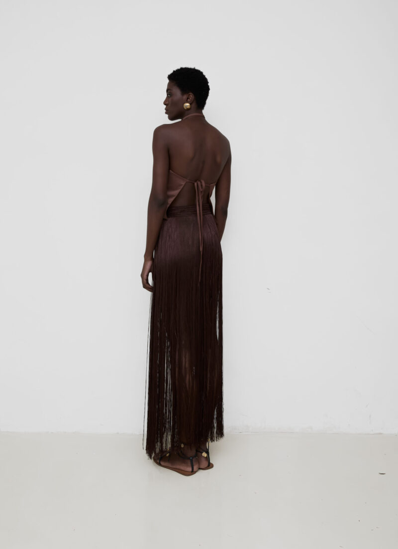 A Blusa Franja Serena é uma peça impactante, produzida inteiramente em franjas de seda, que criam movimento e leveza ao visual. O design frente única e amarração nas costas, tem recortes estratégicos valoriza a silhueta de forma sofisticada, enquanto o caimento fluido das franjas garante um efeito visual marcante. Ideal para ocasiões especiais onde o brilho e a presença são indispensáveis.