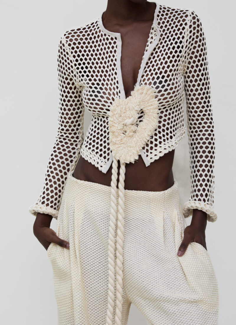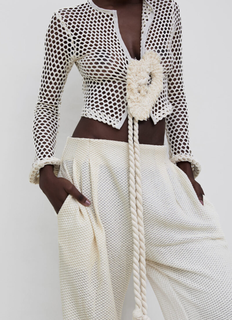 A calça Livi é confeccionada em tecido de tricot textuizada. A peça solta ao corpo possui cintura alta, pregas, ziper invisível, bolsos laterais, recortes frontais, bolso no modelo faca frontais e comprimento longo.