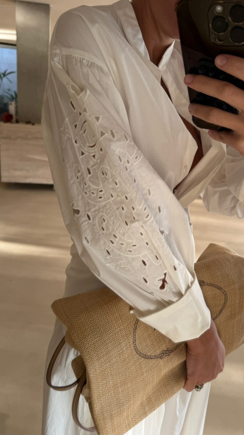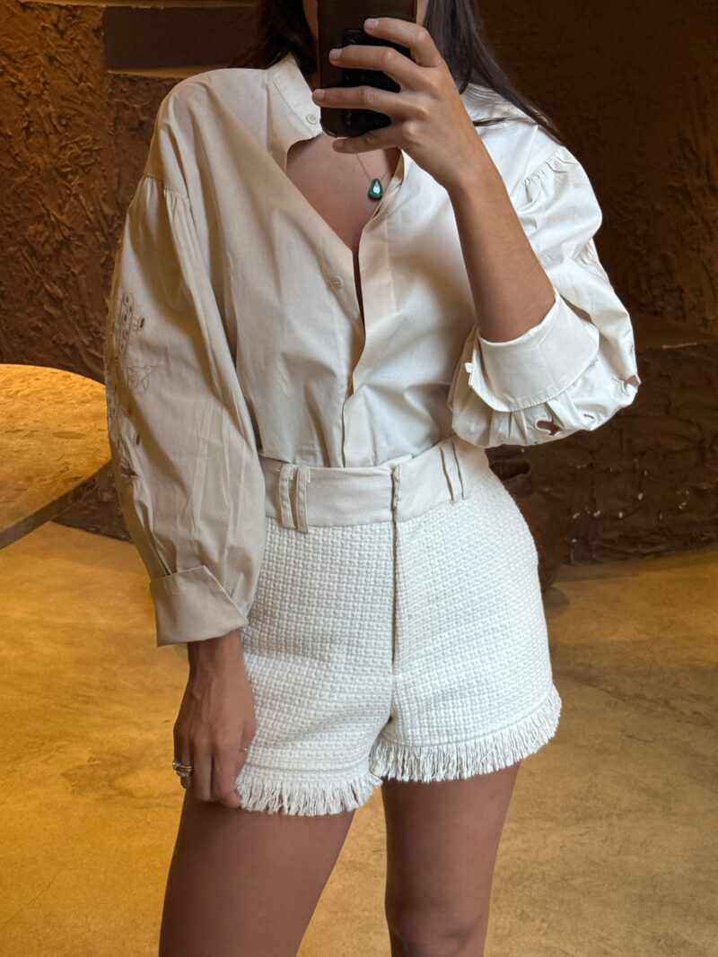 Camisa bordada arau é confeccionada em tecido tricoline de algodão. Possui modelagem em comprimento médio, manga longa, abotoamento frontal coberto, com detalhe bordado na lateral das mangas.
