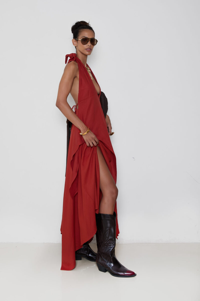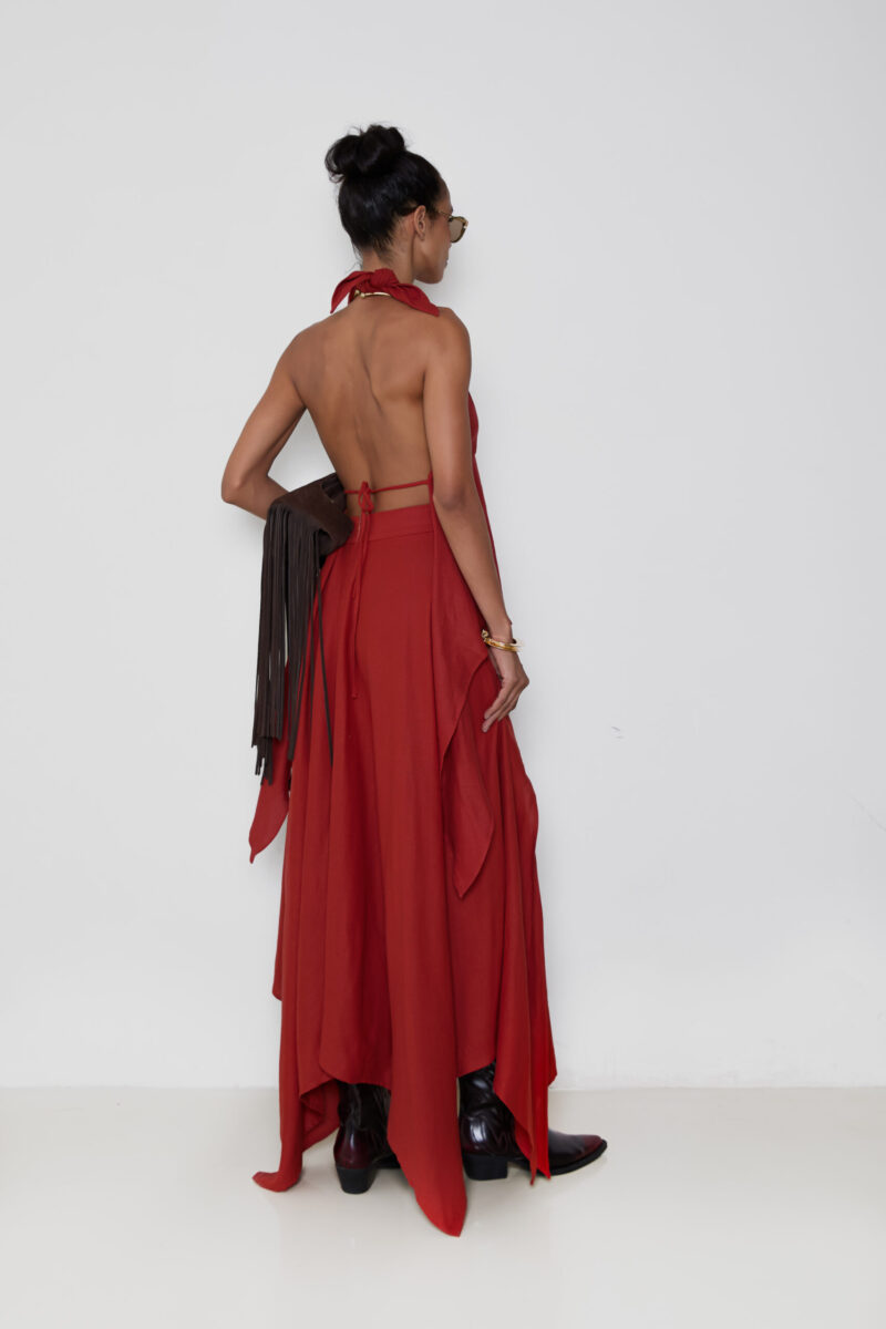 Vestido confeccionado em tecido misto de linho com algodão. Possui modelagem ajustada na parte superior e ampla na parte inferior. Possui comprimento longo, decote aberto nas costas, decote profundo com debate na frente e fechamento por amarração no pescoço.