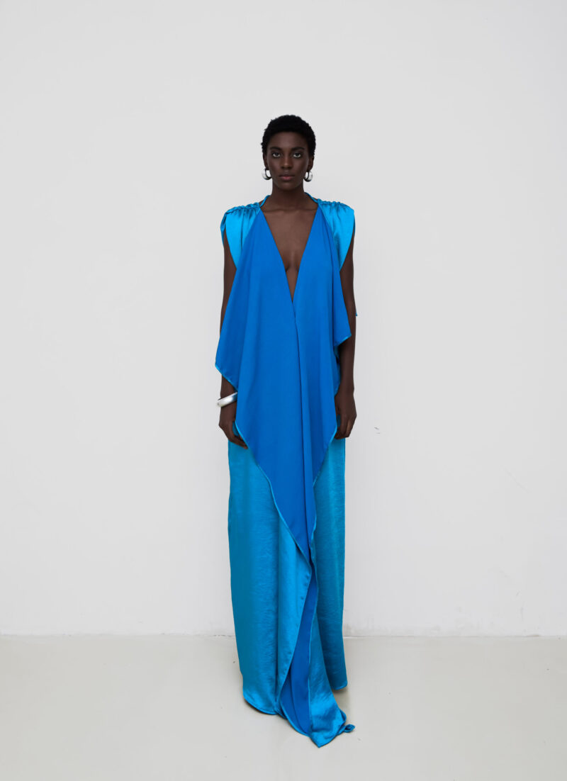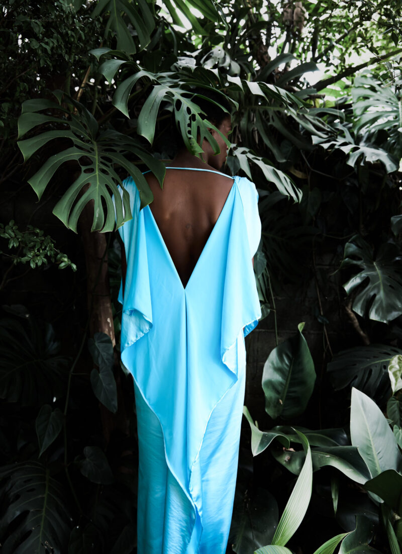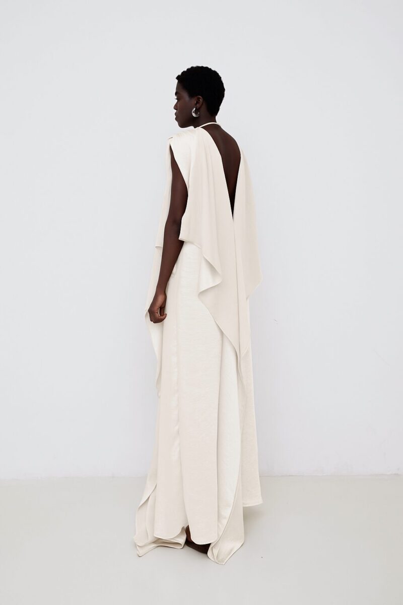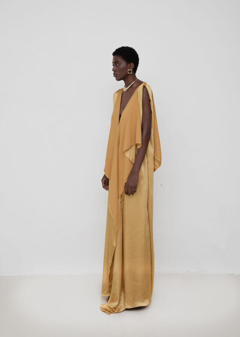 Vestido Saída Nira peça confeccionada no tecido de viscose, com toque acetinado. Possui modelagem com decote em V, frente e costas. Com detalhes de abas soltas no centro frente.