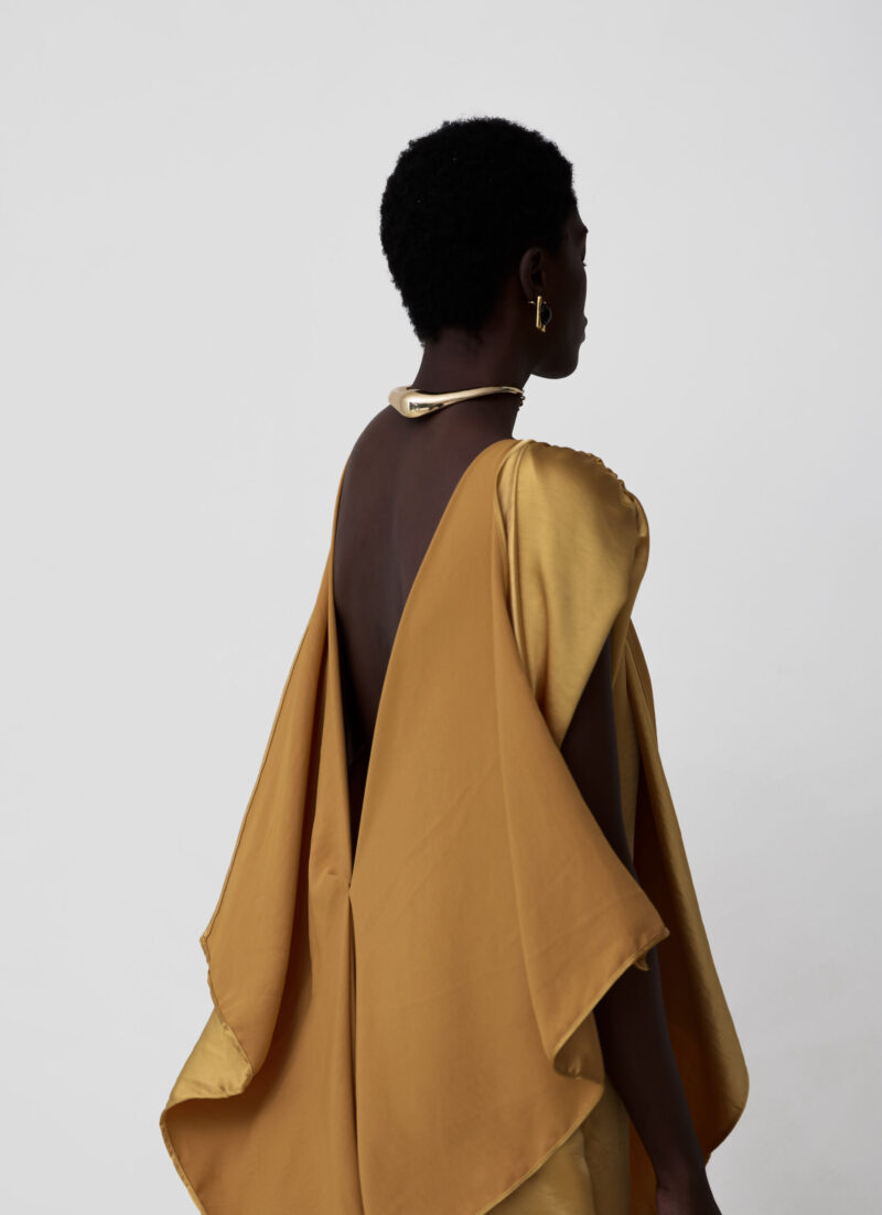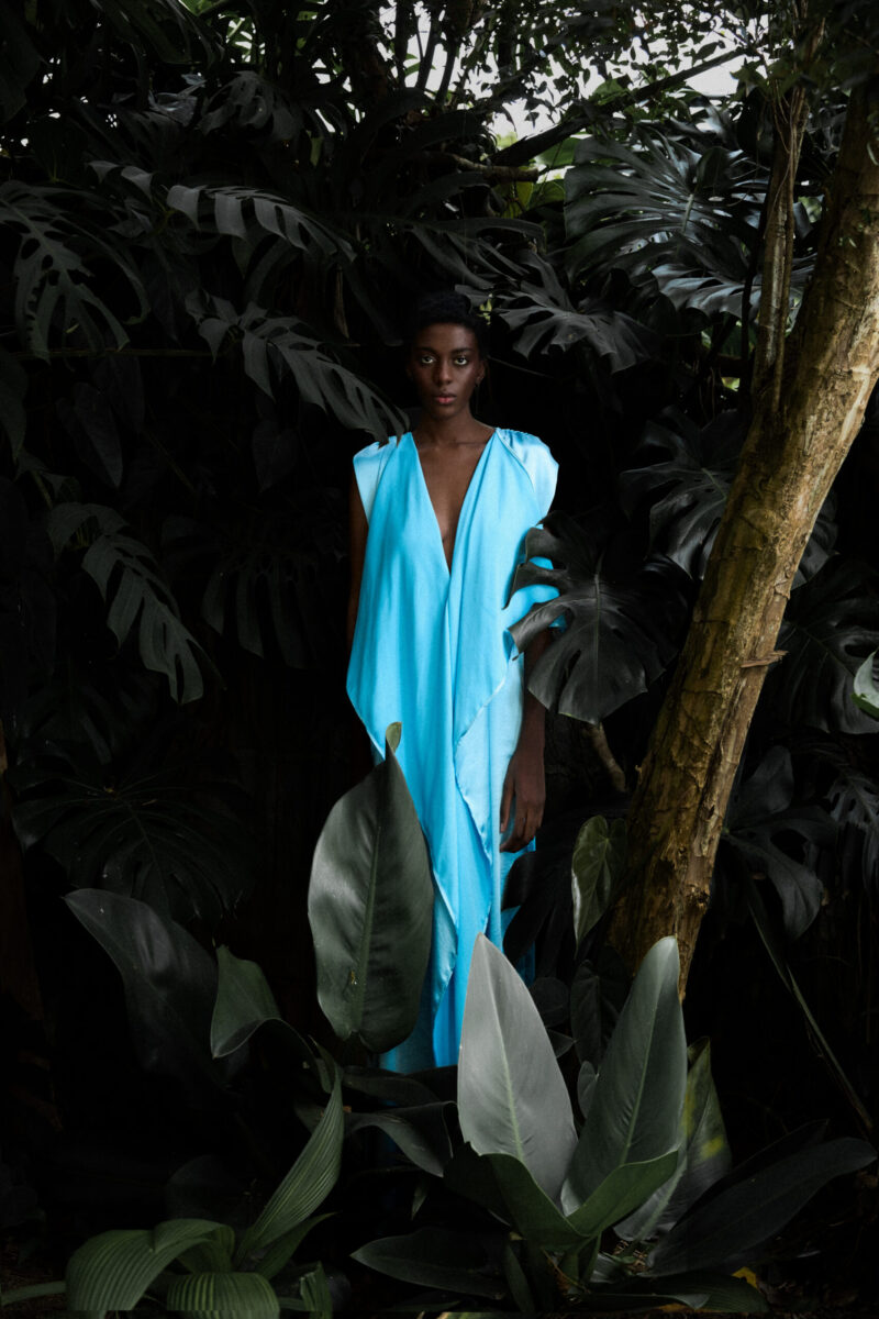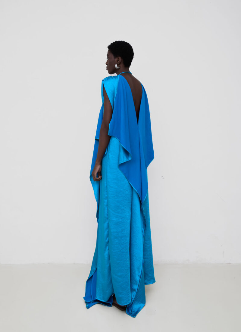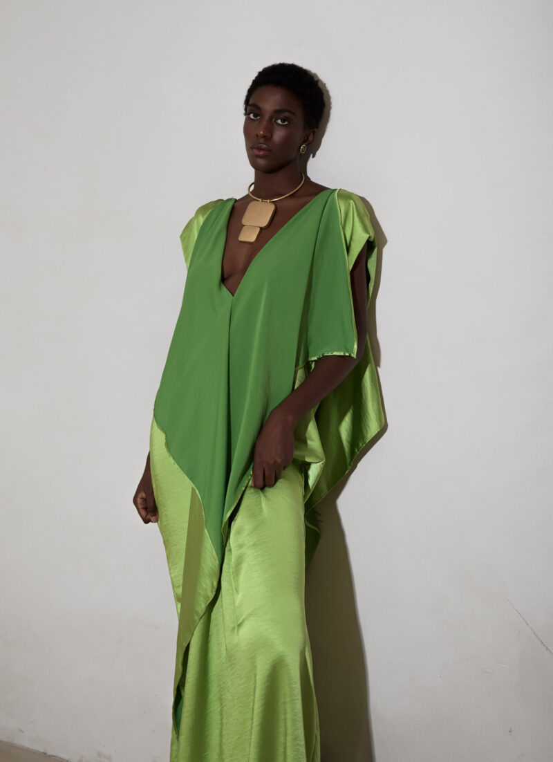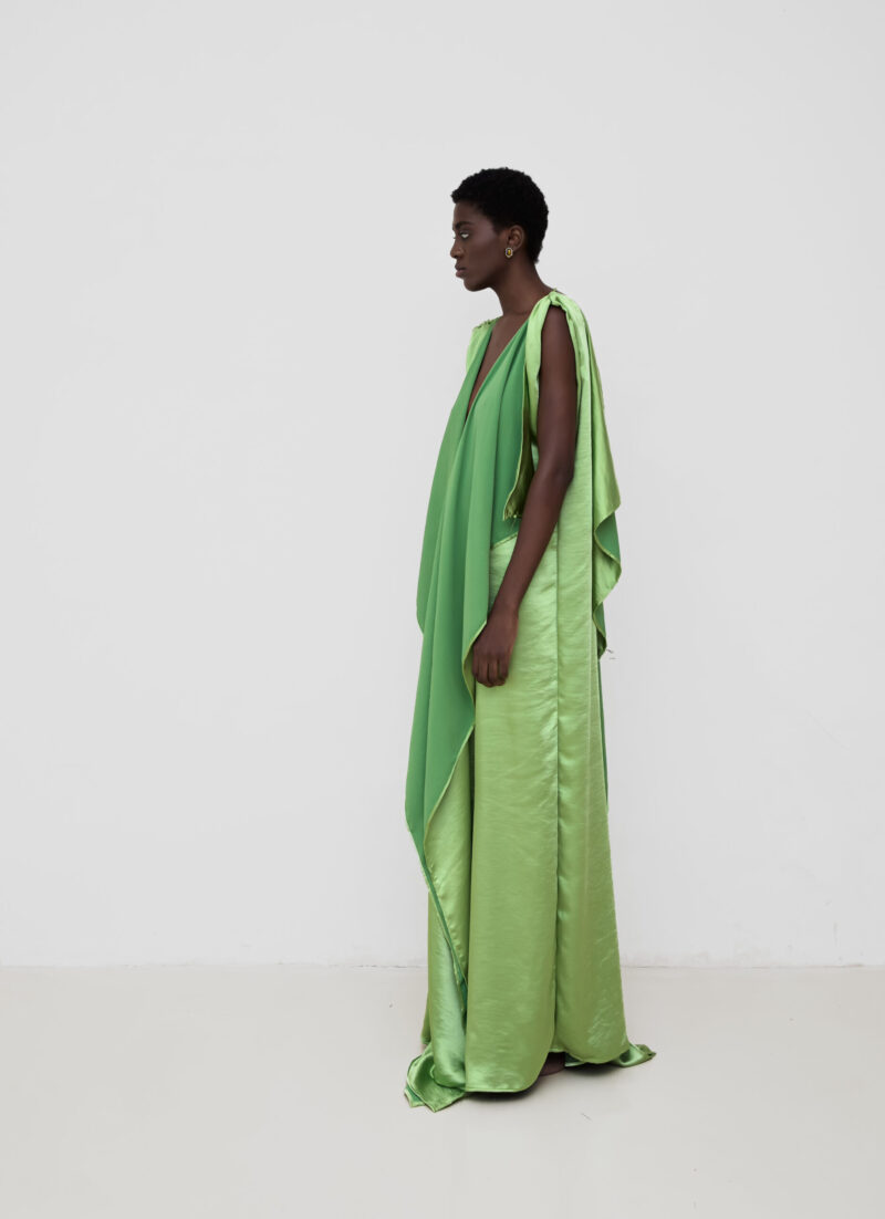Vestido Saída Nira peça confeccionada no tecido de viscose, com toque acetinado. Possui modelagem com decote em V, frente e costas. Com detalhes de abas soltas no centro frente.