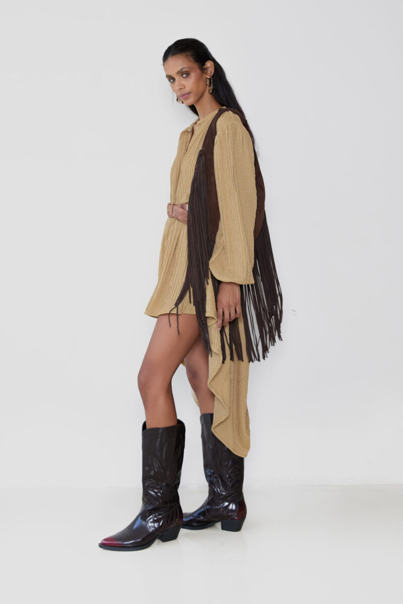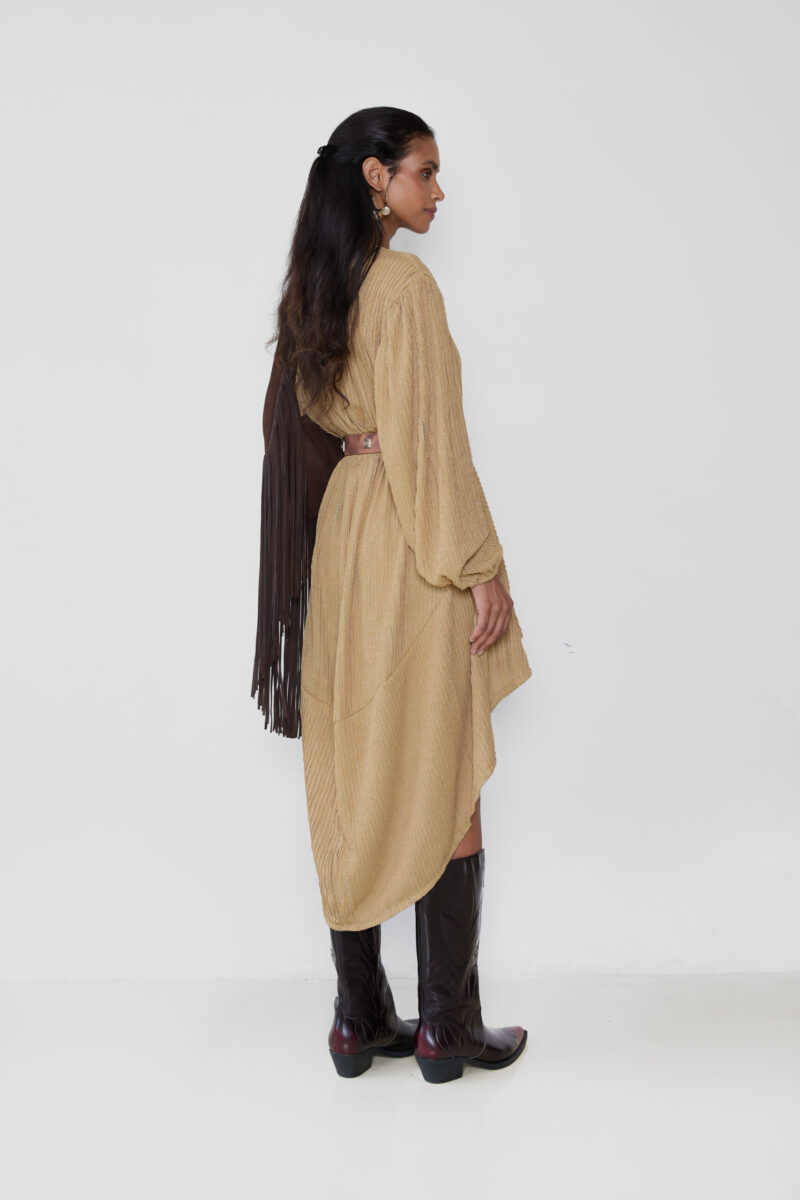 O Vestido Mullet Loe traz uma modelagem ampla e fluida, com comprimento mullet mais curto na frente e alongado atrás que adiciona movimento e um toque moderno ao visual. Confeccionado em malha canelada de textura suave, garante conforto sem abrir mão da sofisticação. Com decote em “V” e mangas longas, é uma peça que traduz perfeitamente a tendência do volume leve e da assimetria, valorizando o corpo de forma natural e elegante. Ideal para looks descomplicados, mas cheios de estilo.