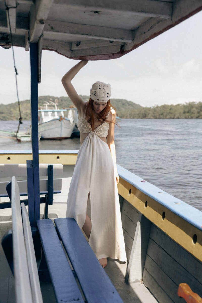 Vestido Solis confeccionado em tecido leve misto de linho e viscose, modelagem ampla, top com detalhe de franja aplicada e alças em corda de algodão.