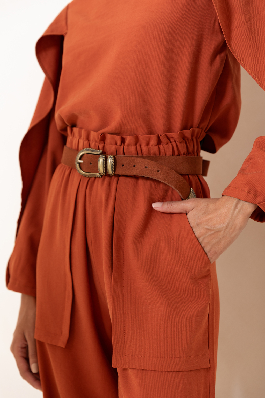 Calça confeccionada em tecido de viscose, modelagem em comprimento longo, cós ajustável com elástico largo, bolso aplicado na frente, bolso com lapela nas laterais e ajuste na barra com faixa no mesmo tecido.