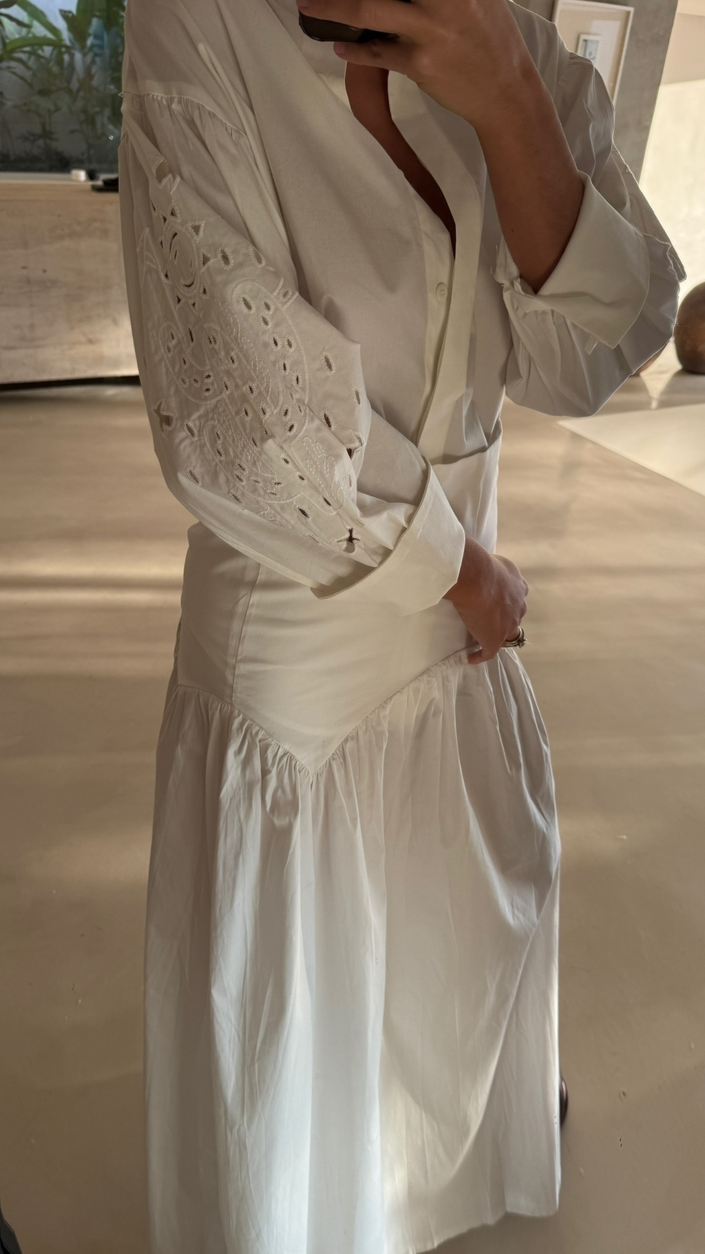 Saia confeccionada em tecido tricoline de algodão. A modelagem é longa, com barra em pontas na frente a e atrás, cós largo e fechamento por zíper invisível na lateral.