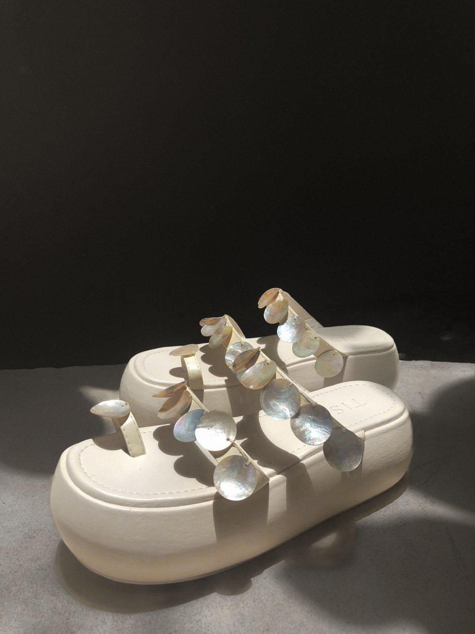 Sandália bordada à mão em peróla com salto plataforma.
